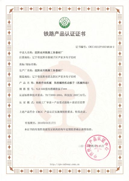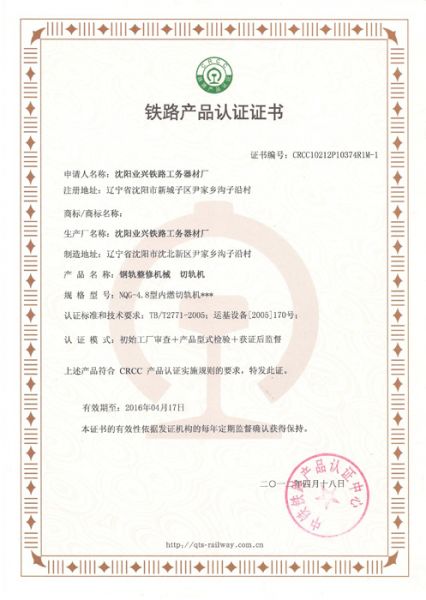 铁路产品认证证书2